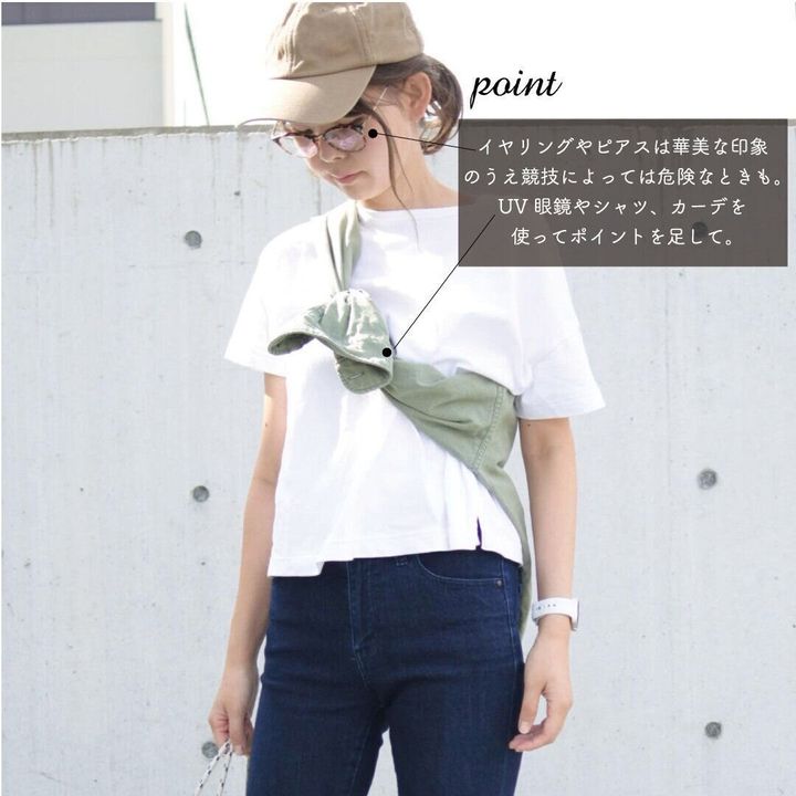 UVダテメガネやシャツをたすき掛けしてポイントをつくって脱おばさんカジュアル。