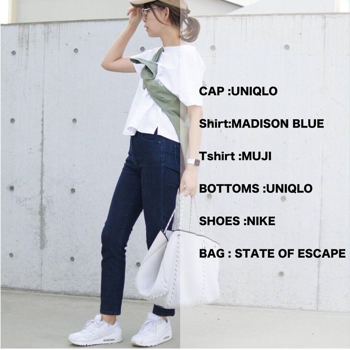 Tシャツは無印良品、キャップとデニムはユニクロです。