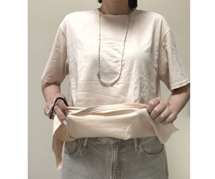 すっきりみせたいけど裾幅が大きすぎるトップスに有効の裏技をご紹介します。