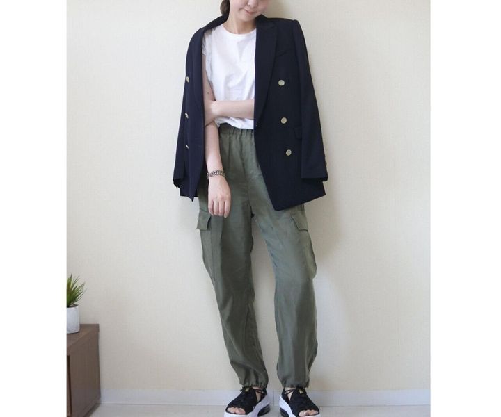 ジャケットとサテンのカーゴジョガーパンツをあわせてきれいめコーデ。