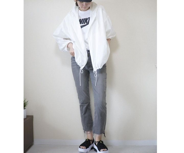 足元がカジュアルなので色やアイテムでややきれいめにまとめるのがおすすめです。