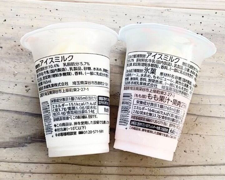 上は北海道産牛乳を56%使用したコクのあるミルクアイスで、下はもも果肉と白桃ピューレ入りのジェラートアイスです。下の段を食べたときに、果肉をしっかり感じられました。
