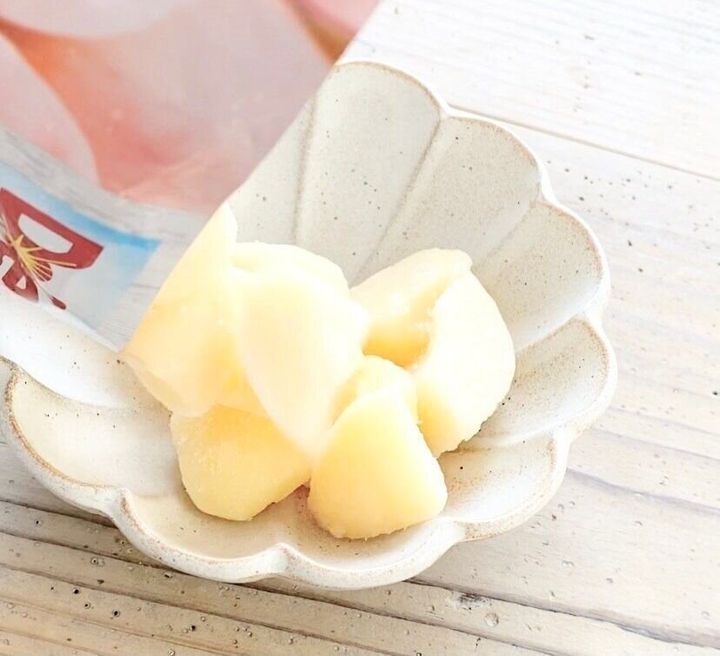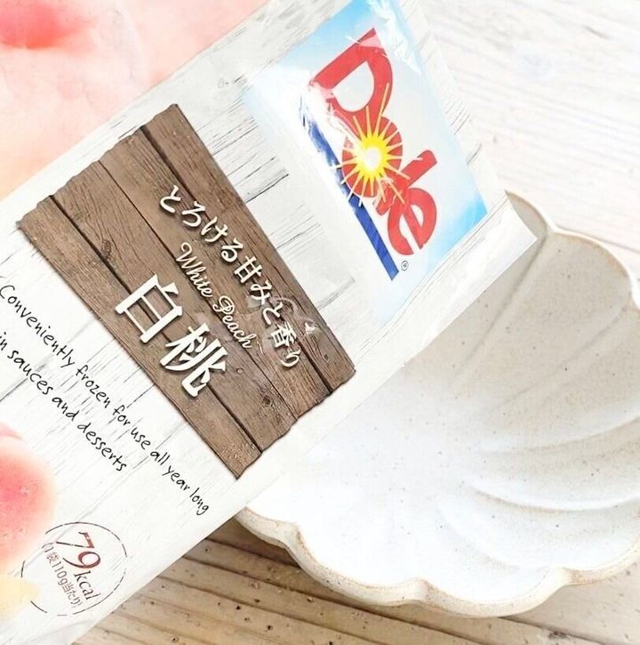 桃以外にも、他のフルーツや、生のフルーツを乗せてもいいですね。レンジで少し解凍しても良さそう。夏なので、今回は、そのまま乗せてみました。