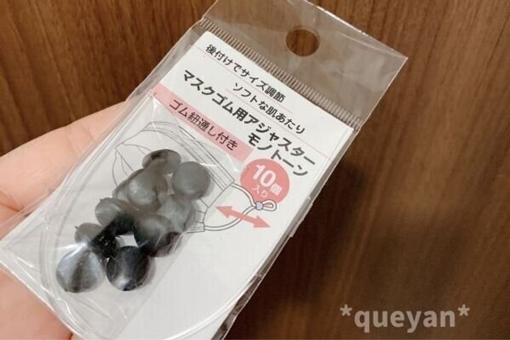 その名の通り、マスクの紐に通して紐の長さを調整できる商品。ダイソーのマスクコーナーの片隅に置いてありました。アジャスター10個(マスク5枚分)と、取り付けのためのテグスがついています。