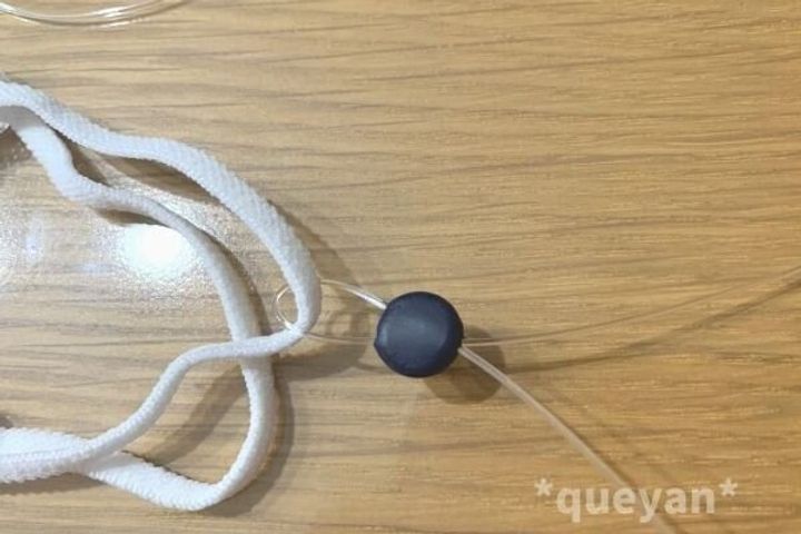 次に、テグスを引っ張りマスクの紐をアジャスターに通し、所望の長さにしたら完成。