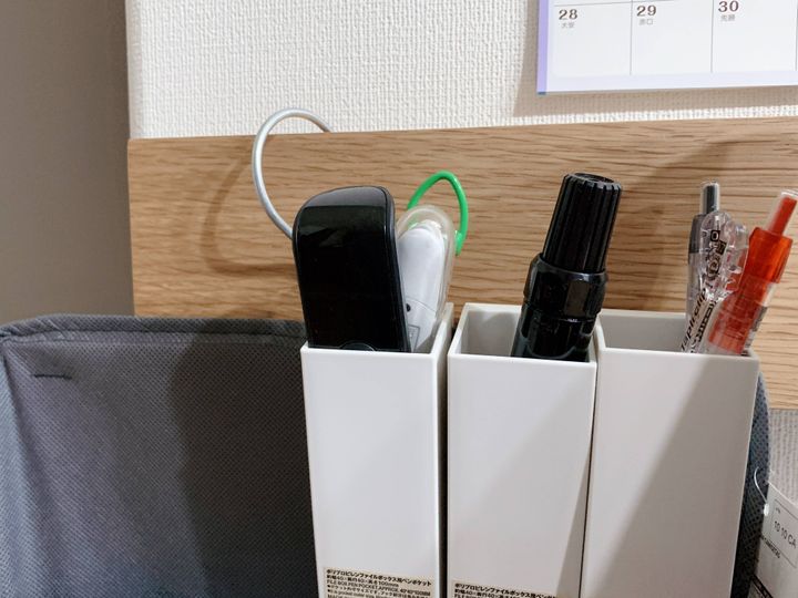 直近では、連絡帳等を書いた後にテーブル上に筆記具を放置しがちだったので、テーブル横の壁に筆記具を入れるペンポケットを導入しました。これにより、ペンを入れるだけというワンアクションで立ち上がることなく片付けられるようになり、テーブル上が片付きやすくなりました。