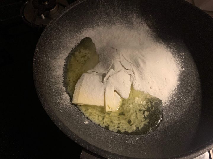 1.フライパンにバターを入れ、温めます。少し溶けてきたら小麦粉をふるい入れ、へらで混ぜます。