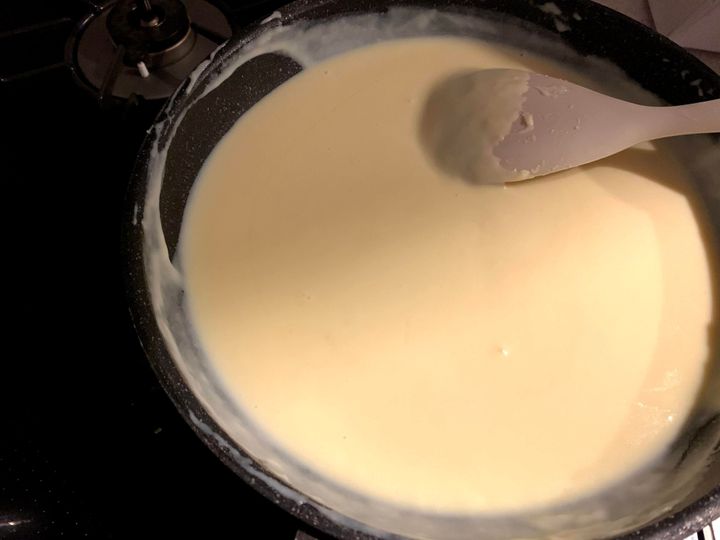半分加えたあたりからシャバシャバしだして、液体の量が多いのではと不安になりますが、最終的にしっかりとろみがつくのでご安心ください。