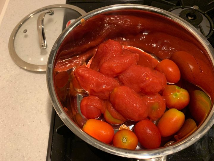 1.トマト缶、ミニトマト(あれば)、水、塩、白だしを入れて中火にかけます。