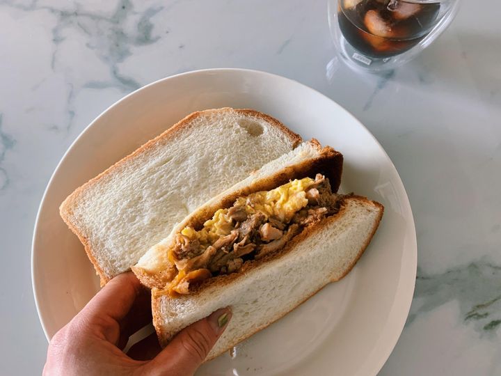 バーベキュー味にしたプルドポークとスクランブルエッグをトーストでサンド!