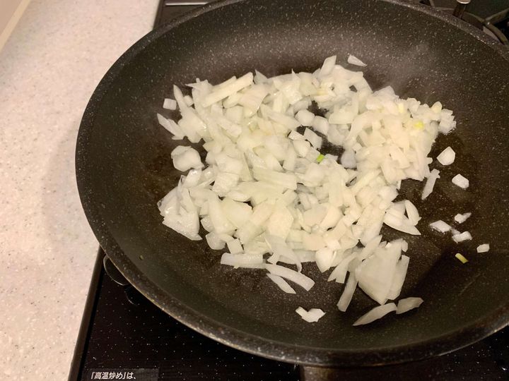 1.油をしいたフライパンで、玉ねぎとにんにくを炒める