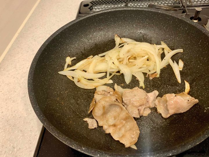 2.豚肉を食べやすい大きさにして、塩胡椒して焼く