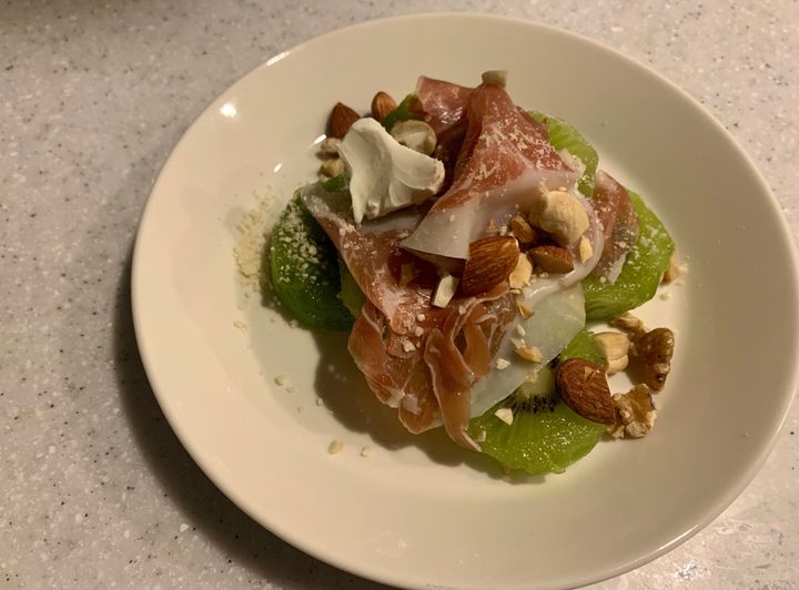 熟れたキウイに生ハムをのせ、クリームチーズを添えました。生ハムメロンをはじめ、フルーツと生ハムが合うことは有名ですが、キウイも予想以上においしかったです。ナッツも散らしておしゃれなおつまみに。
