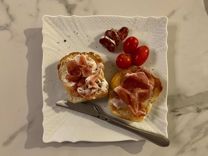 トーストしたバターパンにクリームチーズを塗って、ハモンセラーノを載せました。クリームチーズと生ハムは最強に、合います。