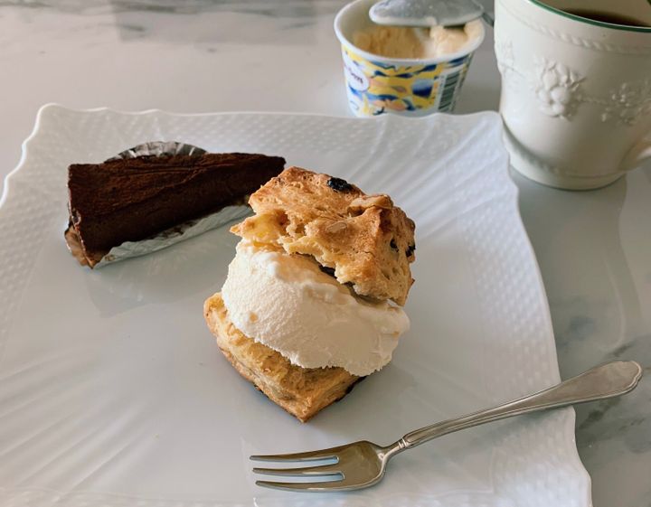 温めたスコーンにアイスを乗せて溶かしてもよし、冷めたスコーンに挟んでもよし。アイスクリームがスコーンをしとしとにして、これも最高です。どちらも単品で食べるよりも贅沢な食べ方ですよね!