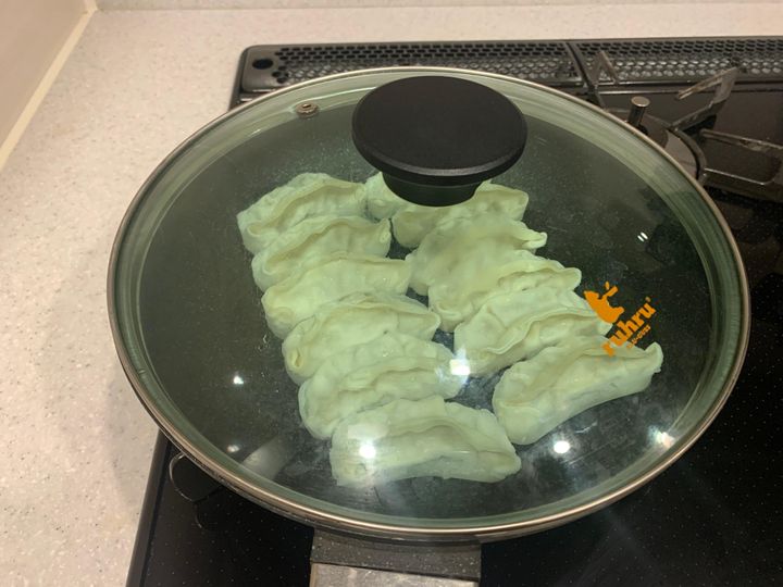 フライ返しで端からカリカリつついて、餃子の下にフライ返しを差し込み、全体を剥がします。お皿をフライパンに乗せてからパカっと裏返します。綺麗に羽が付きました!