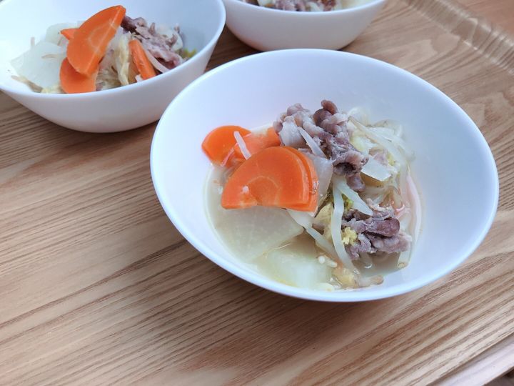 大根、かぼちゃ、にんじん、もやし、白菜、かぶなどを入れ、お肉は、鶏肉の場合はもも肉を、あとは豚肉などを入れて調理しています。