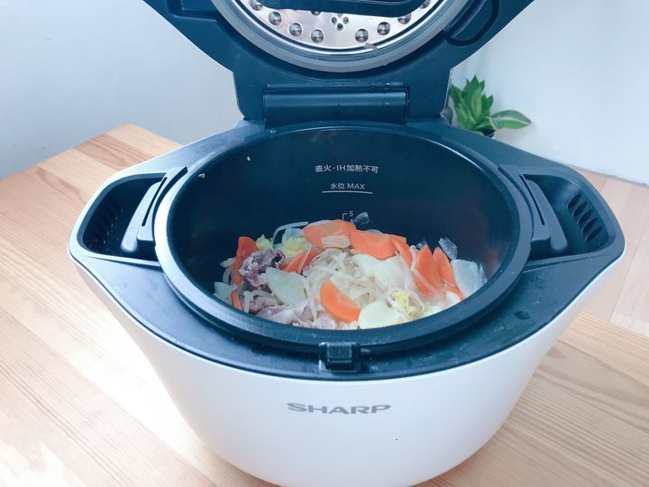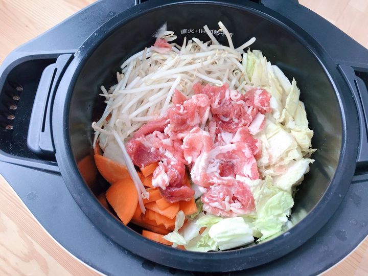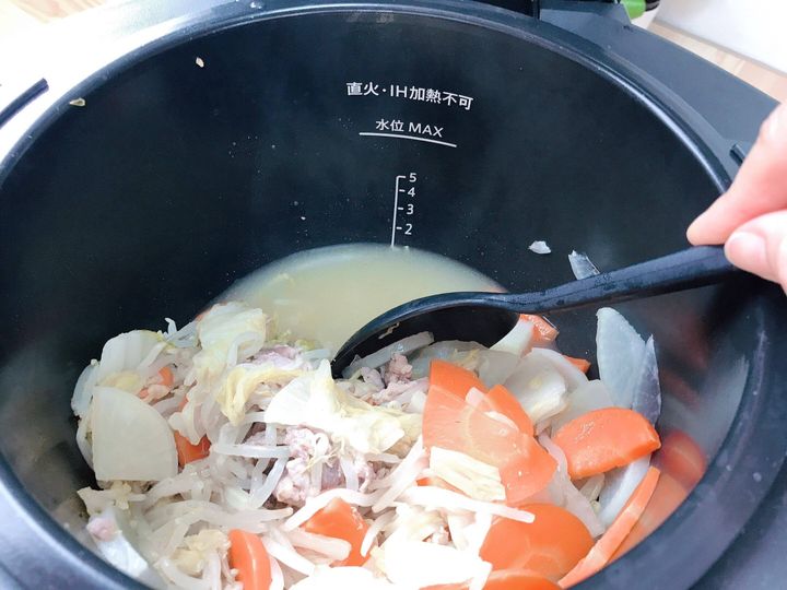 2.4リットルのサイズに対して、山盛りの野菜を入れて、お塩は小さじ1.5くらいで調理しています。