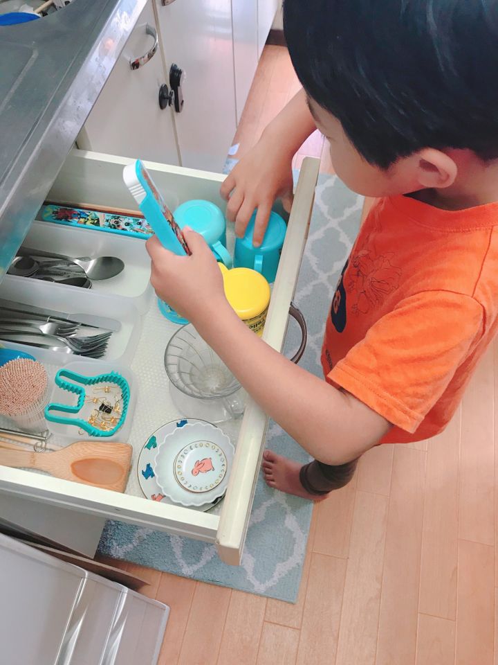 カトラリーを入れる引き出しに子供のプラスチックのコップ、お箸を入れました。タオルも、子供の引き出しの一番手前に収納を変えました。