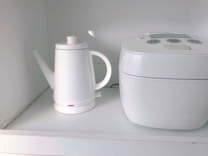 炊飯器の横には、新しく迎えた電子ケトルがあります。