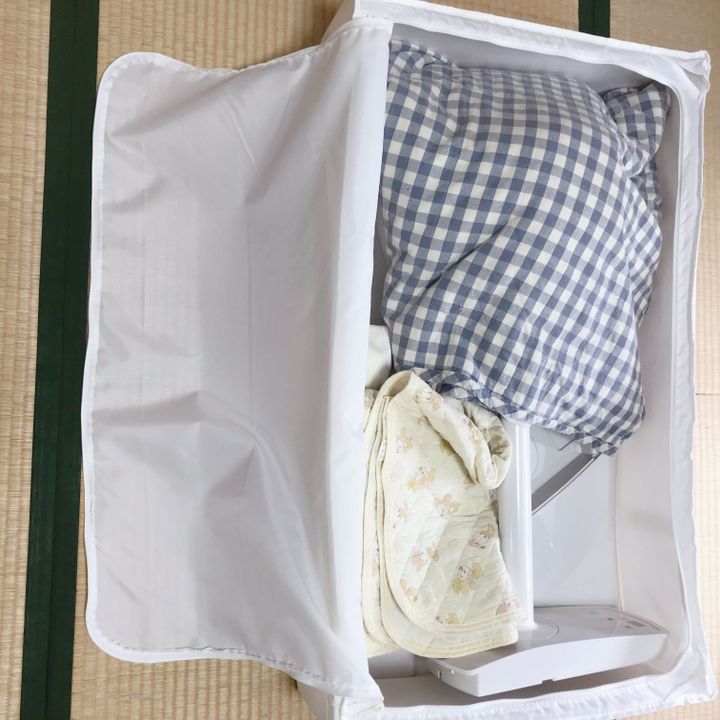 夏場の扇風機を出した後のスクッブには、使用しない毛布などを収納しています。