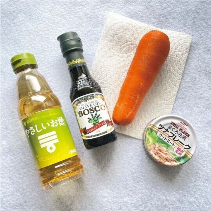 人参の細切りだけ頑張る必要がありますが、スライサーがあれば包丁もまな板も用意しないで時短できます。ほかにも、ツナの油きりが面倒であればそのまま使っても大丈夫。人参を好きなだけ細切りにしたら、あとはツナとオリーブオイルとやさしいお酢をお好みで混ぜ合わせるだけ!我が家は「やさしいお酢」を使っていますが、ほかの酢を使って酸味が心配であれば砂糖を足して味を調整してみてくださいね。