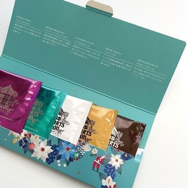 スリランカで最も歴史のある老舗紅茶ブランド、ジョージスチュアートのティーアソートです。クイーンズチョイス、イングリッシュブレックファスト、シナモン&クローブ、ハニーバニラ、チョコレートドリームの5種類のフレーバーが楽しめます。パッケージの色はパールピンクのほかに、アイスブルーの2種類。キラキラなクリスマスデザインはギフトにもピッタリですね。