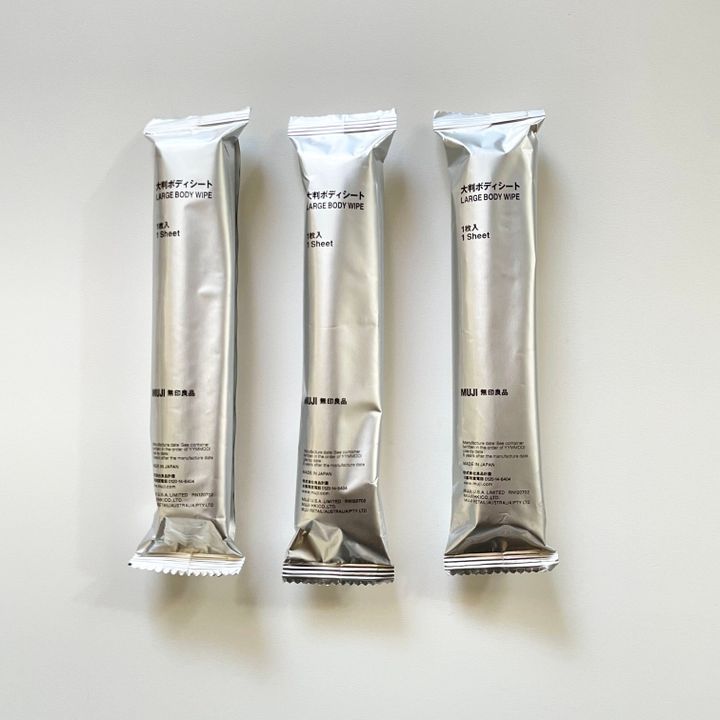 災害時には電気やガス、水道などのライフラインが止まり、お風呂に入れない日が何日も続くかもしません。そんな場合に備えておきたいのが、無印良品の「大判ボディシート」です。