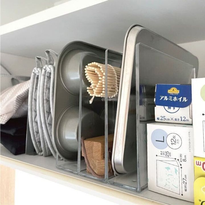 オーブンの天板や鍋蓋、使用頻度の少ない卵焼き用フライパンや細々したモノを収納しています。立てかけることで場所を取らずスッキリできるうえ取り出しやすく重宝しています。