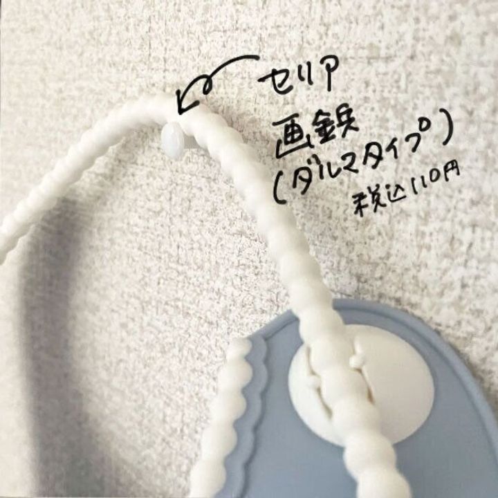 子どもの食事エプロン、イヤホンなど軽いモノは画鋲で引っかけて出しっぱなしです。やはり毎日使うモノなので、箱などにしまうより手軽ですし高さ調整も簡単なので気に入っています。ただ壁に穴ができるので心配な方は、穴埋めの補修を調べておくのをオススメします。私はセリアのダルマタイプの画鋲(税込110円)を使っていますが、いろんな色や形があるのでお気に入りを探すのもオススメです。