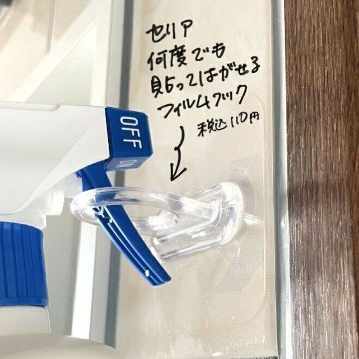 セリアの「何度でも貼ってはがせるフィルムフック」(税込110円)をキッチンの死角に貼り、アルコール消毒スプレーや掃除用スプレーを引っかけて収納しています。耐荷重も1kgまで大丈夫なので日用品なら安心です。夫も掃除のたびに使うので夫婦それぞれ使いやすい高さに設置しています。