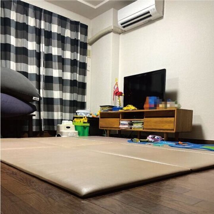 食事や寛ぎよりも息子の遊び場がメインな我が家の1LDK賃貸リビング。寝る直前までオモチャを散らかして遊ぶので、毎晩のリビング片づけは息子が生まれてからの習慣になっています。とはいえ、しまう場所を細かくしたりしまい込むと親子ともども面倒なのでTVボード周辺にざっくり置くだけです。