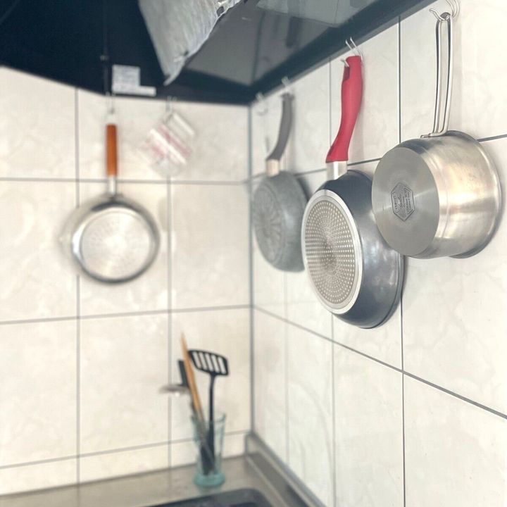 料理でよく使うフライパンや調理器具はフックでぶら下げたり