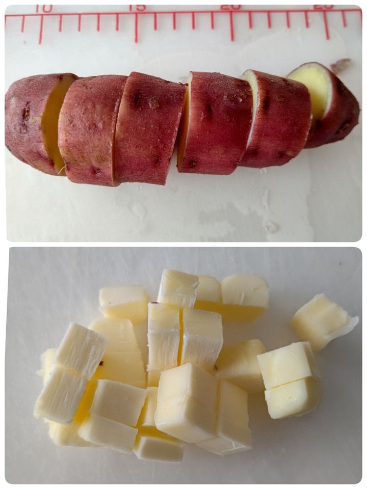 時短したい場合は、さつまいもを洗ってラップに包みレンジ600Wで5分加熱→裏返して4分加熱したり(さつまいもの大きさと太さで加熱時間は調整して下さい)フライパンにクッキングシートを敷いてさつまいもを乗せ、下に水200ccを入れて蓋をして30分蒸し焼きにしても(さつまいもの大きさや太さで加熱時間は調整してください)。どちらも竹串がスッと刺さるまで柔らかくして下さい。