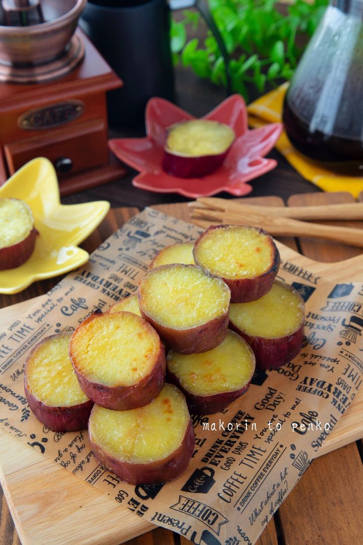フライパンで蒸し焼きしたさつまいもを輪切りして、バターと砂糖を乗せて焼くだけ。