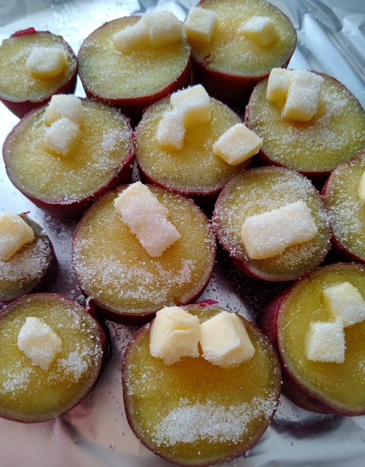 3.さつまいもを輪切りし、アルミホイルに重ならないように並べてバターバランス良く乗せ、グラニュー糖をまんべんなくふりかける。