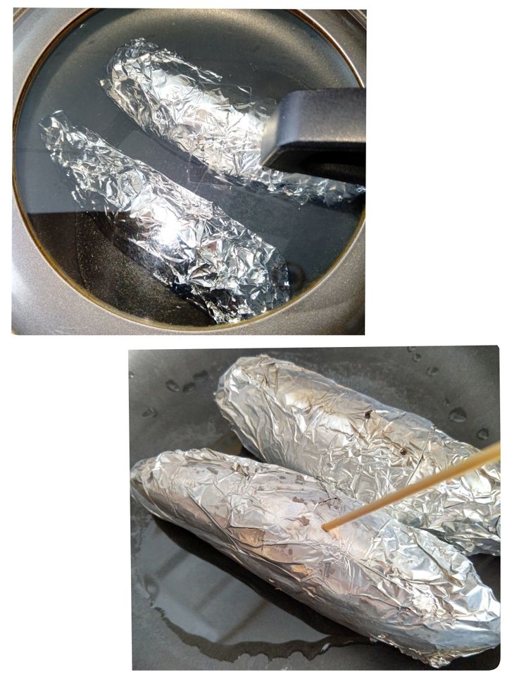1.さつまいもはきれいに洗い、アルミホイルで包んでフライパンに並べる。水200ccを入れて蓋をして火にかけ、沸騰したら火を弱めて途中で1度裏返し40分(竹串がスッと刺さるまで)蒸し焼きする。水が無くなりそうになったら足す。