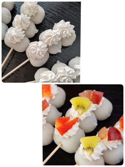 冷凍ぷち大福を解凍し、串に刺してホイップクリームとフルーツを飾るだけ。