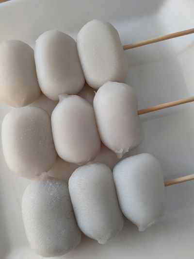 1.冷凍ぷち大福は自然解凍し、3個づつ串に刺す。
