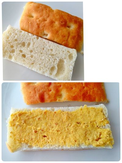 1.フォカッチャは半分に切り、1枚にぬるだけでカレーパンを塗る。