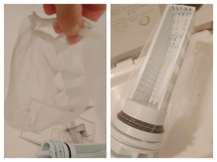 洗濯槽そうじをした後の排水フィルターの水切りネットはビックリする汚れ…。でもネットがしっかりキャッチしてくれていて安心なんです。なので、洗濯槽そうじをしてからパーツそうじの順番で。同じ日にしたり、翌日にしたりと簡単なので軽い気持ちで取り組めます。