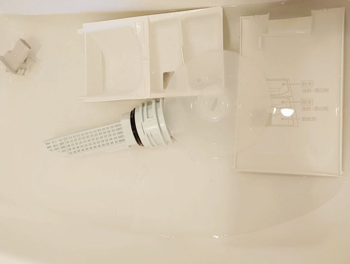 洗濯洗剤の投入口のパーツや蓋を全てはずして、お湯と過炭酸ナトリウムで浸け置きしています。排水フィルターはセリアの水切りストッキングネットをはずしてゴミ箱に捨てるだけ、あとは一緒に浸け置きします。排水フィルターはたまにのぞいてみて汚ければ交換、1分かからないです。ほったらかしなので出かける前や、なにか作業しながらできますよ。時間をおいて気になるところがあれば軽くブラシできれいにし、水でながして完了です。新しい水切りストッキングネットを付けてセットします。