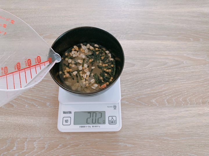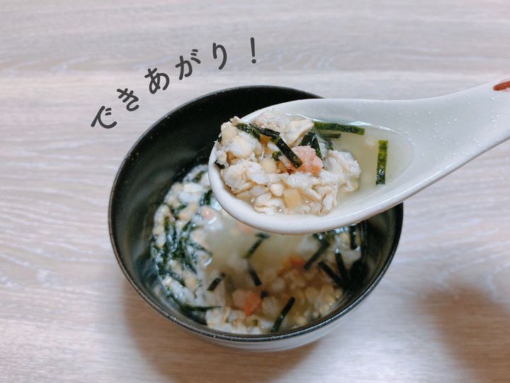普通のお茶漬けを作るときのようにお湯をかけるのではなく、水を使って電子レンジで温めるのがポイントです。