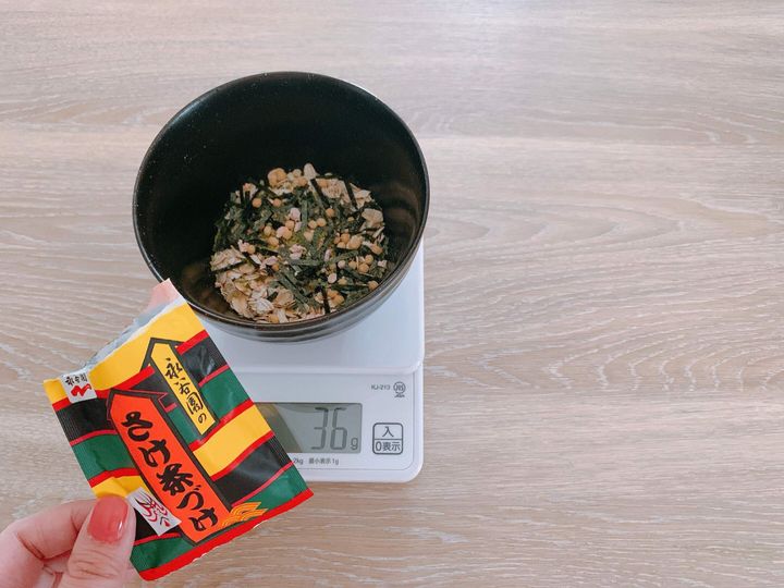 1.耐熱容器にオートミールを30g入れ、お茶漬けのもとをかける。