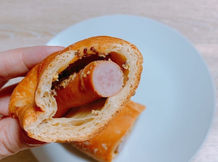 もち麦パンの中身は、あらびきソーセージと粒マスタードのみというシンプルな構成。