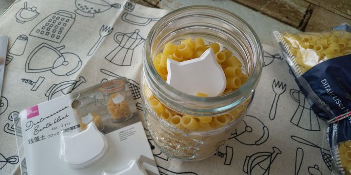 パスタやマカロニを保存容器に入れる際、こちらの猫ちゃん型ブロックを使えば可愛いく湿気取りができます。