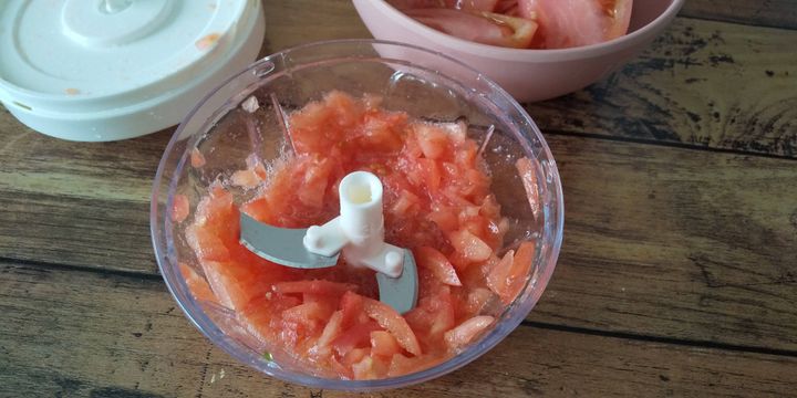 くし形に切ったトマトを4つ入れてみました。ハンドルを引くと最初は重みがあるように感じましたが、すぐに細かくなりやりすぎるとピューレ状に。