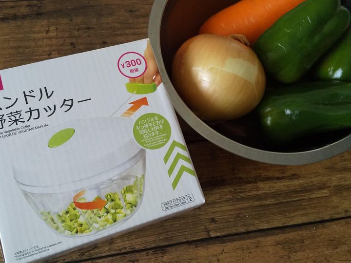 今回は、野菜のみじん切りが面倒だな~、時間かかるな~と思うときに使える、ダイソーの【ハンドルカッター】(300円)についてご紹介します。