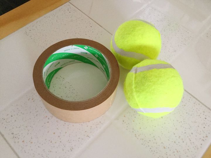 1)まず、テニスボールを2つ並べてガムテープで固定したものを作ります。