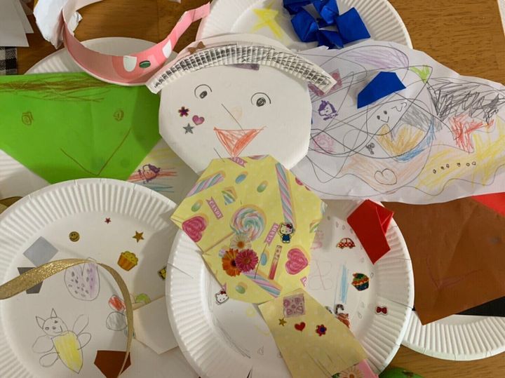 それまでの自粛生活の中で作ったこどもたちの手作り作品を壁やテーブルに飾って、リビングを作品展会場に変身!